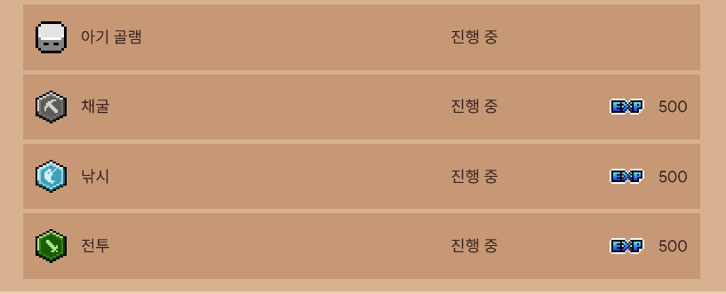 - 경험치 표입니다. 반복한다고 경험치가 바뀌거나 하지 않습니다. 즉 죽어라 낚시만 해도 경험치는 얻습니다. 저는 한 번 씩 다른 콘텐츠를 진행해보고 40렙까지 낚시만 했습니다. (참고로 아기 골렘은 보스 콘텐츠인데 아직 클리어 하지 못하였습니다.)