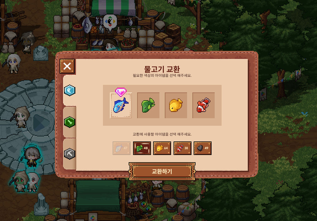 - 플레이 기본 구조는 위의 세 퀘스트 중에서 골라서 진행하시면 됩니다. 참고하실 점은 납품 받는 아이템의 색깔이 랜덤이다보니 숫자가 안맞을 수 밖에 없습니다. 이에 대한 보완책으로 교환소가 있는데, 같은 종류의 채집물과 교환이 가능합니다. 교환비는 2:1이고, 채집 미니게임을 실패했을 때 얻게 되는 아이템은 3:1로 교환이 가능합니다.