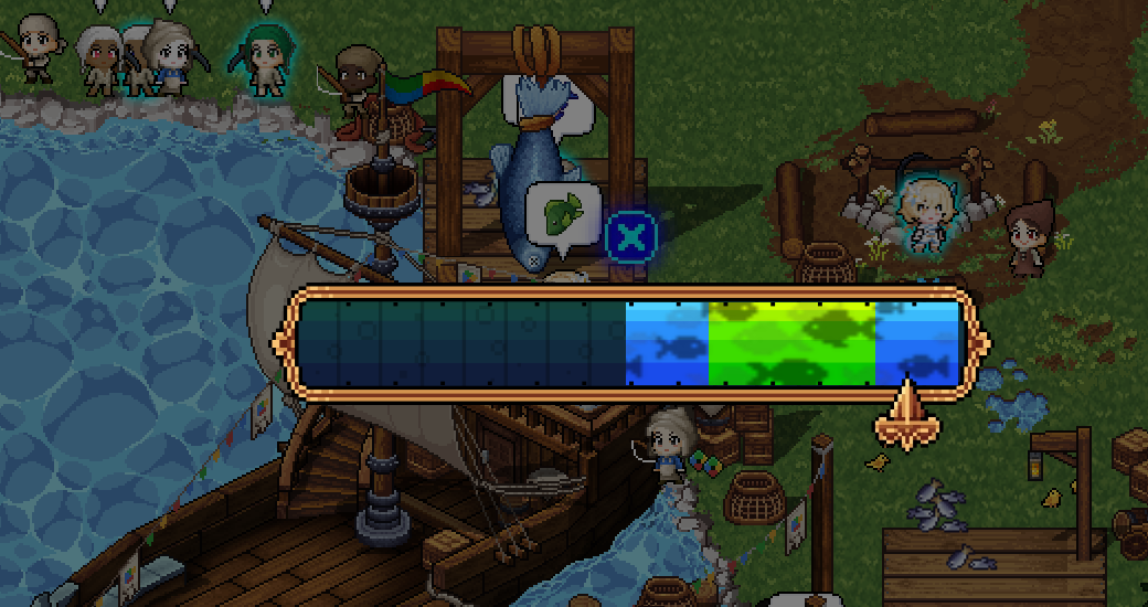 낚시: 맵 좌측 하단의 물가에서 진행 할 수 있으며, 우리가 흔히 아는 타이밍 맞추기 게임입니다. 레벨이 오르면 아래와 같이 목표 영역이 넓어지기 때문에 갈수록 더 난이도는 쉬워집니다.