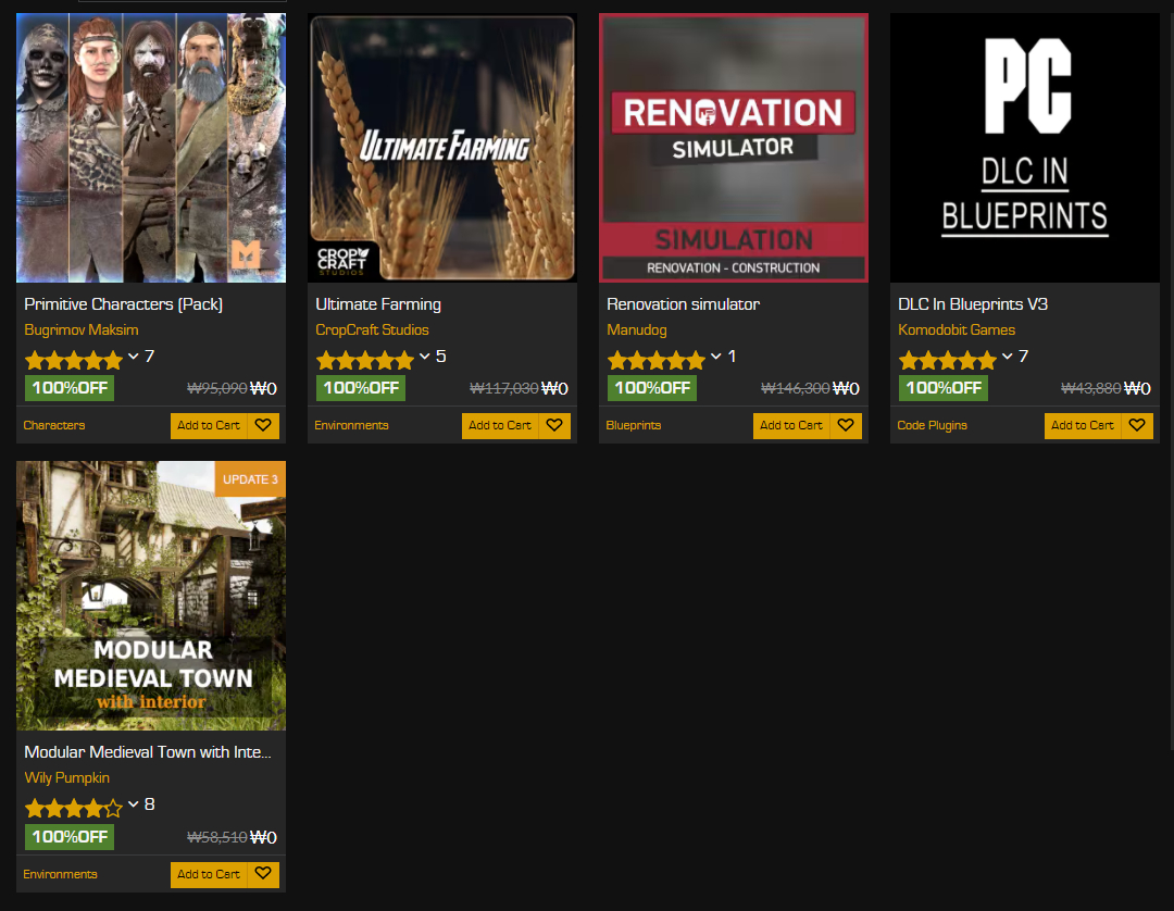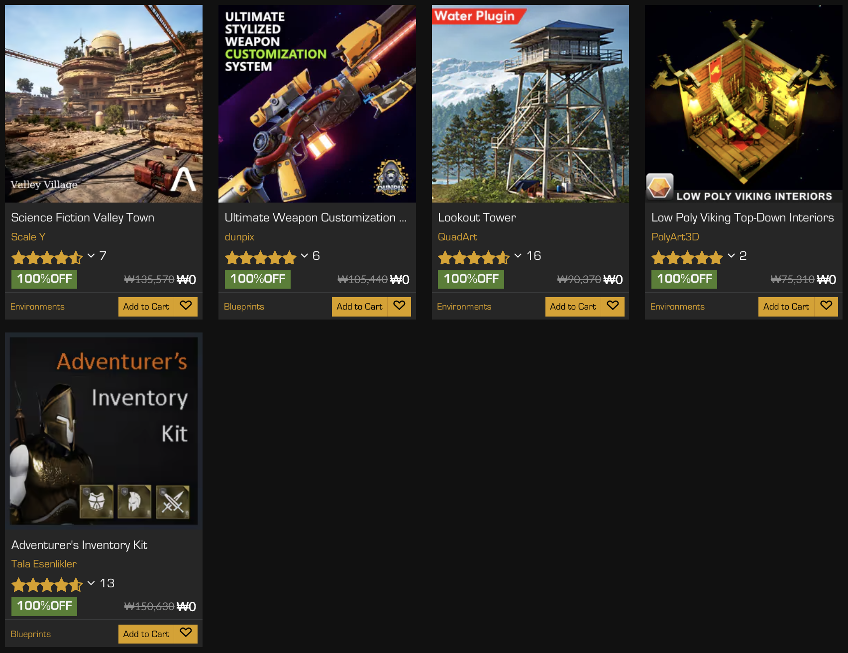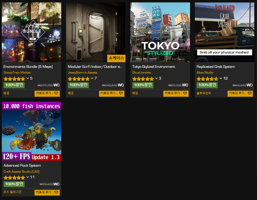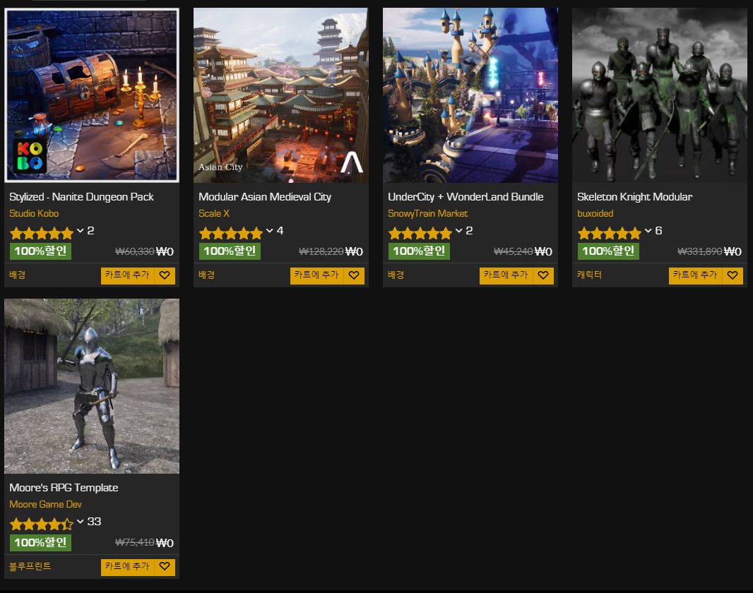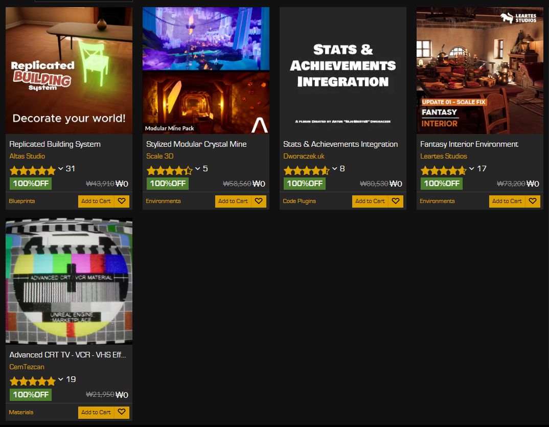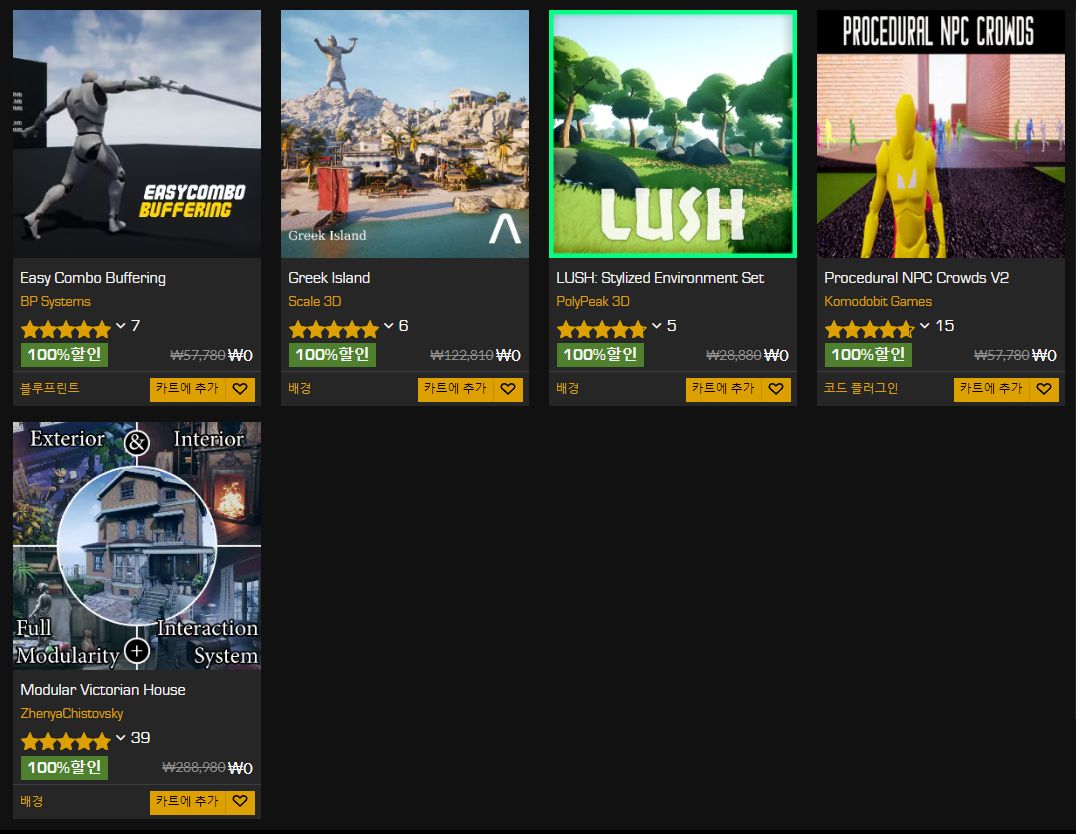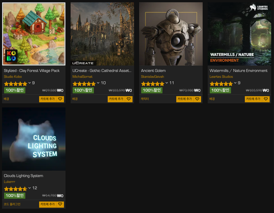 # 2024.09 이달의 무료 콘텐츠※ 언리얼 엔진에서 사용 가능한 컨텐츠입니다. 일정 기간 동안 할인율 100%로 제공하는 정기 이벤트입니다. 구입 후 언리얼 엔진 라이브러리에서 다운 및 이용이 가능합니다. 당장 사용하지 않더라도 일단 받아놓으시면, 언젠가 필요해질 수 있습니다. - 마켓플레이스 이달의 무료 콘텐츠 페이지https://www.unrealengine.com/marketplace/ko/assets?count=20&sortBy=effectiveDate&sortDir=DESC&start=0&tag=4910 마켓플레이스 탐색&검색 | 언리얼 엔진 마켓플레이스 www.unrealengine.com